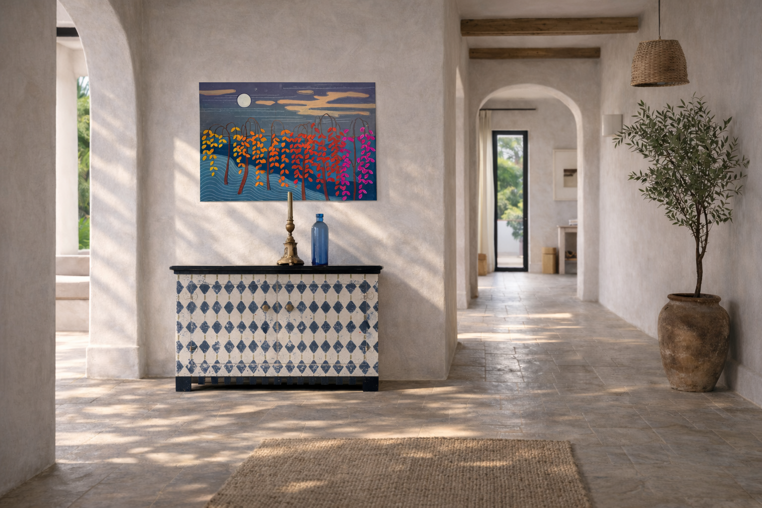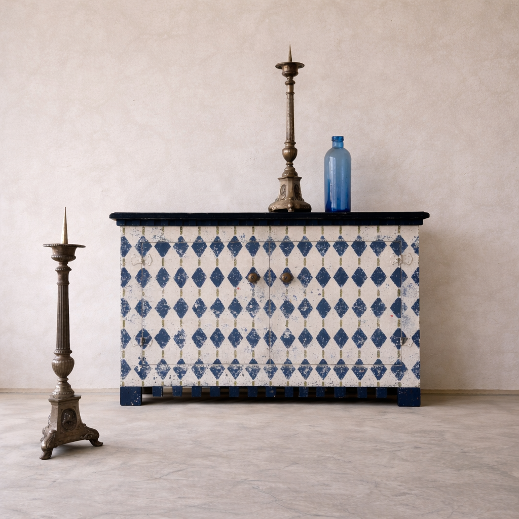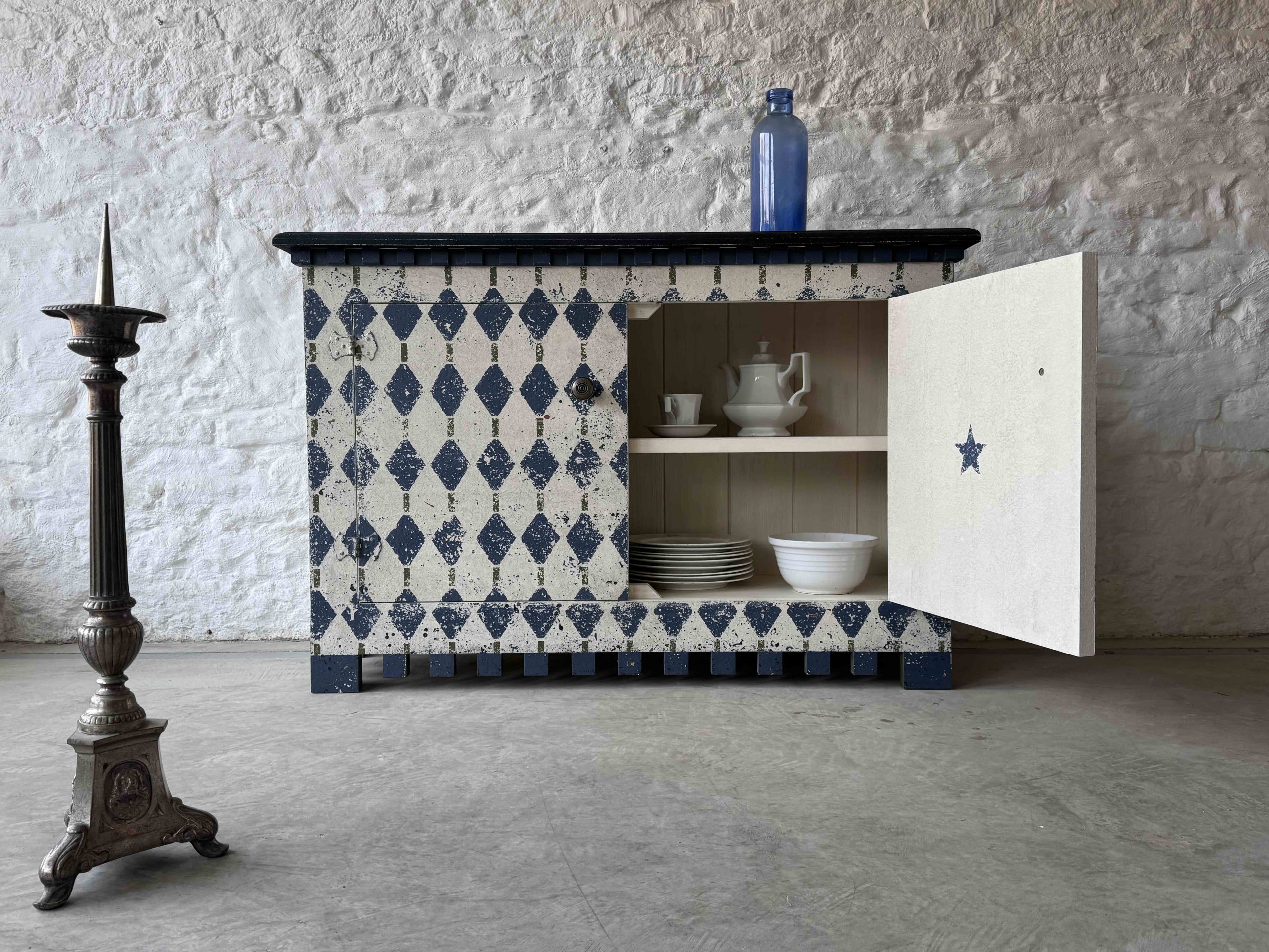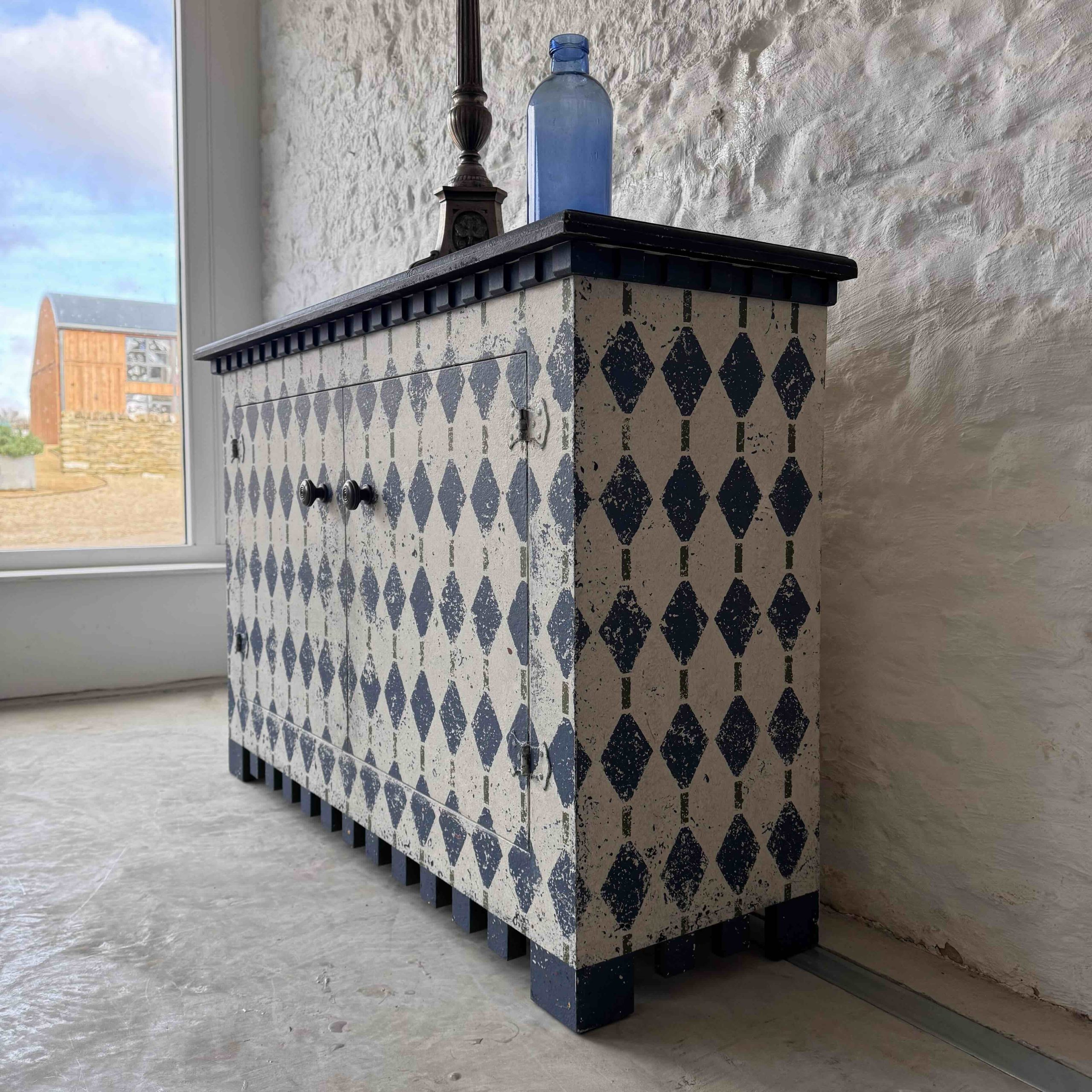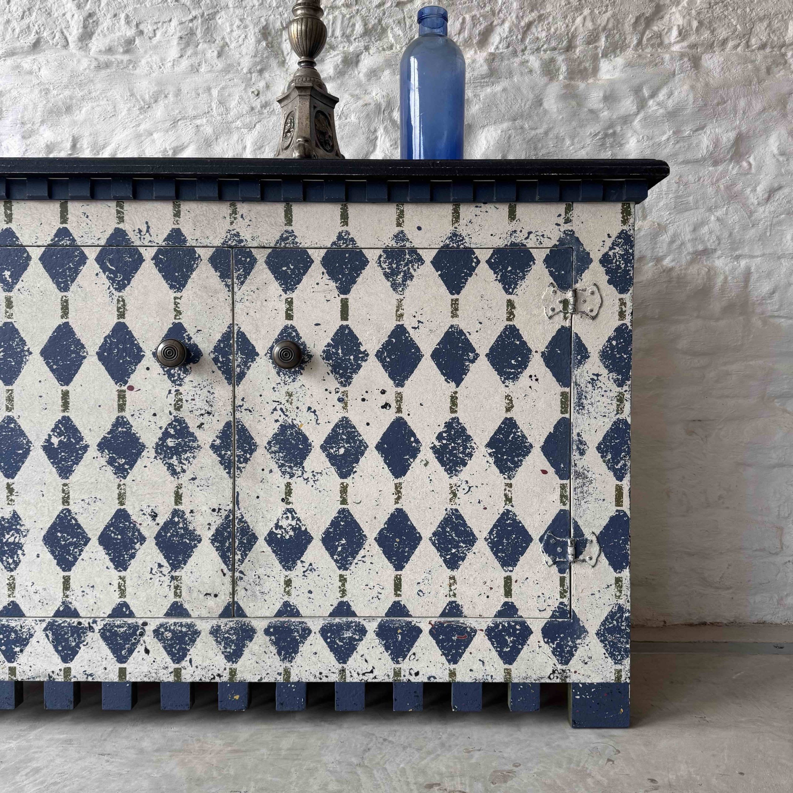 The harlequin pattern is Stiffkey Blue with hints of Bancha Green by Farrow and Ball – with lots of other colours coming through the many layers of paint.