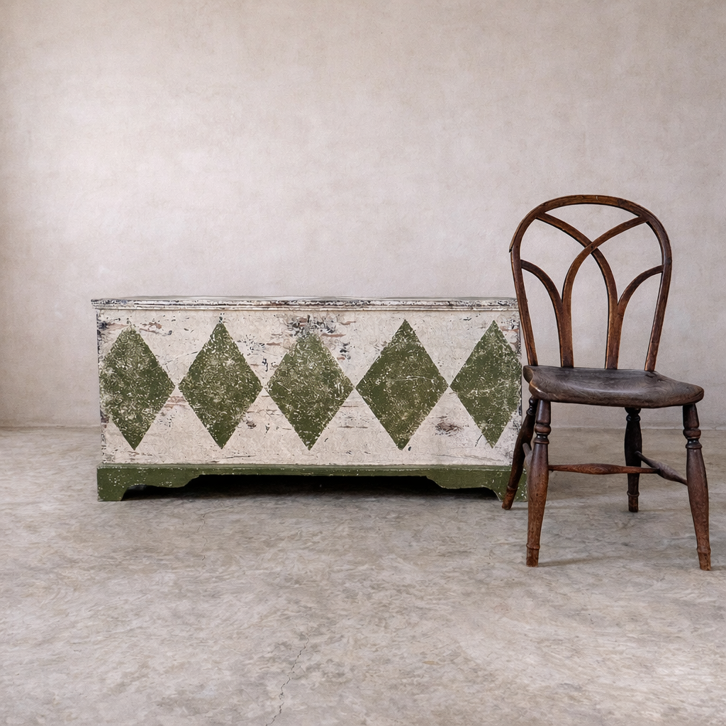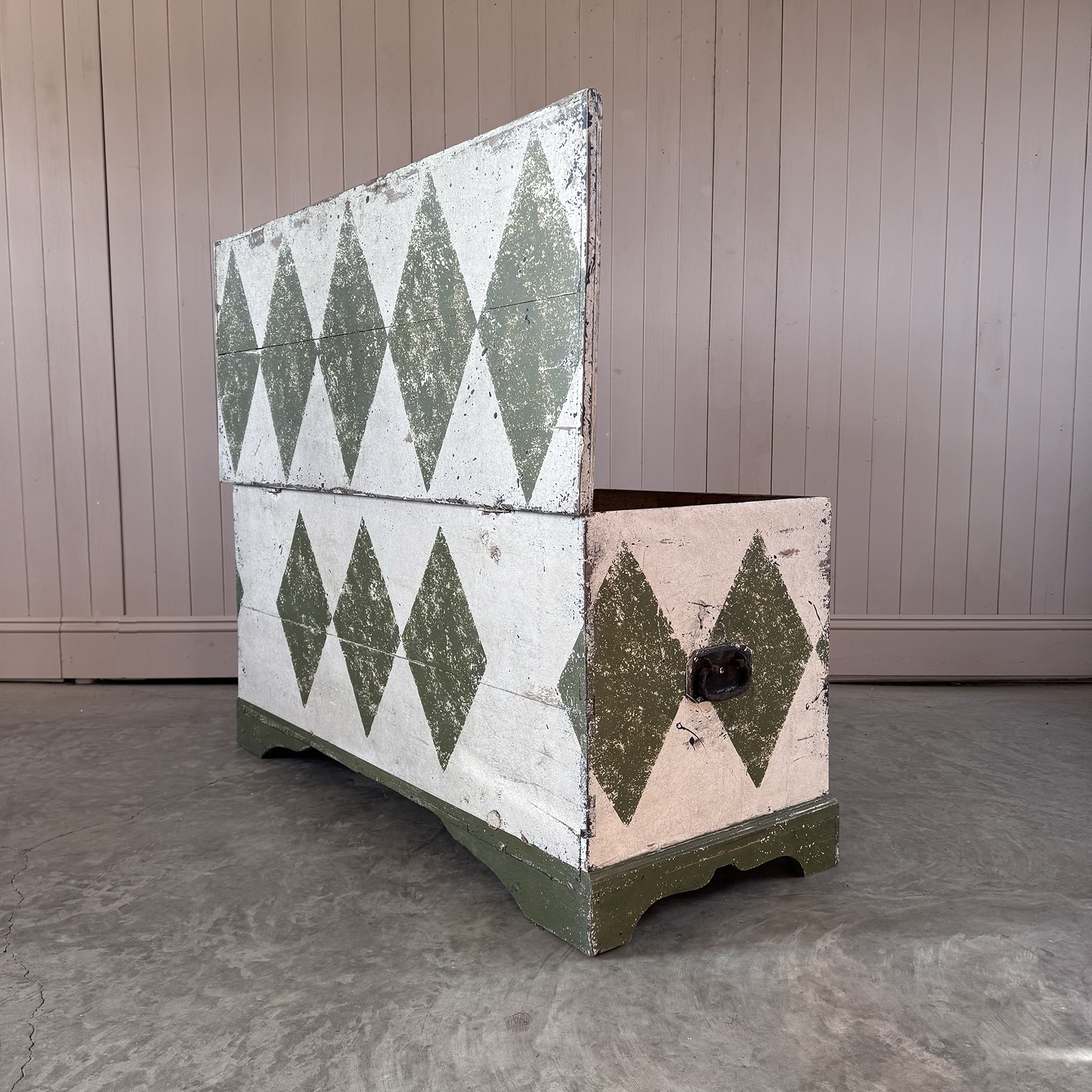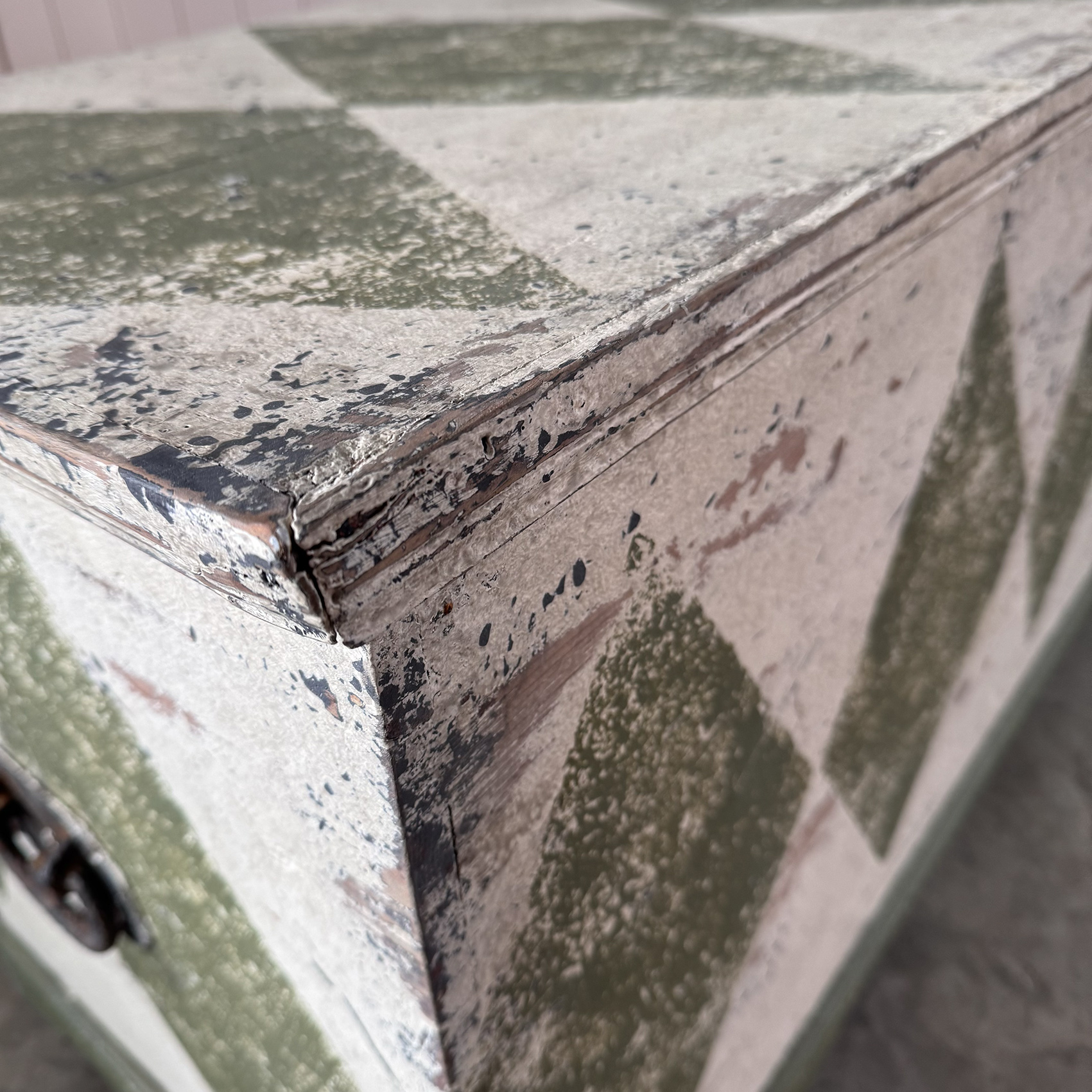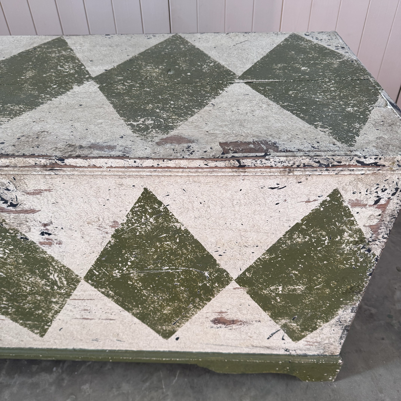 This storage chest is late 19th Century having been recently painted, by us, with this giant Bancha Green ( F & B ) harlequin design.