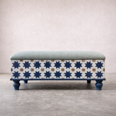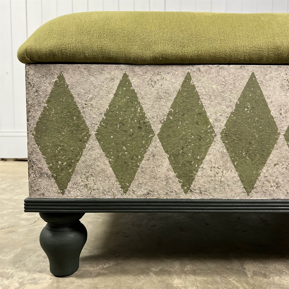 The inspiration for these footstools came from an antique Italian Ottoman which we bought and sold with a similar construction. Made from solid timbers and painted using many layers of colours and upholstered with a Cloth Shop heavyweight linen. These boxes are designed with seats that lift up with storage underneath.