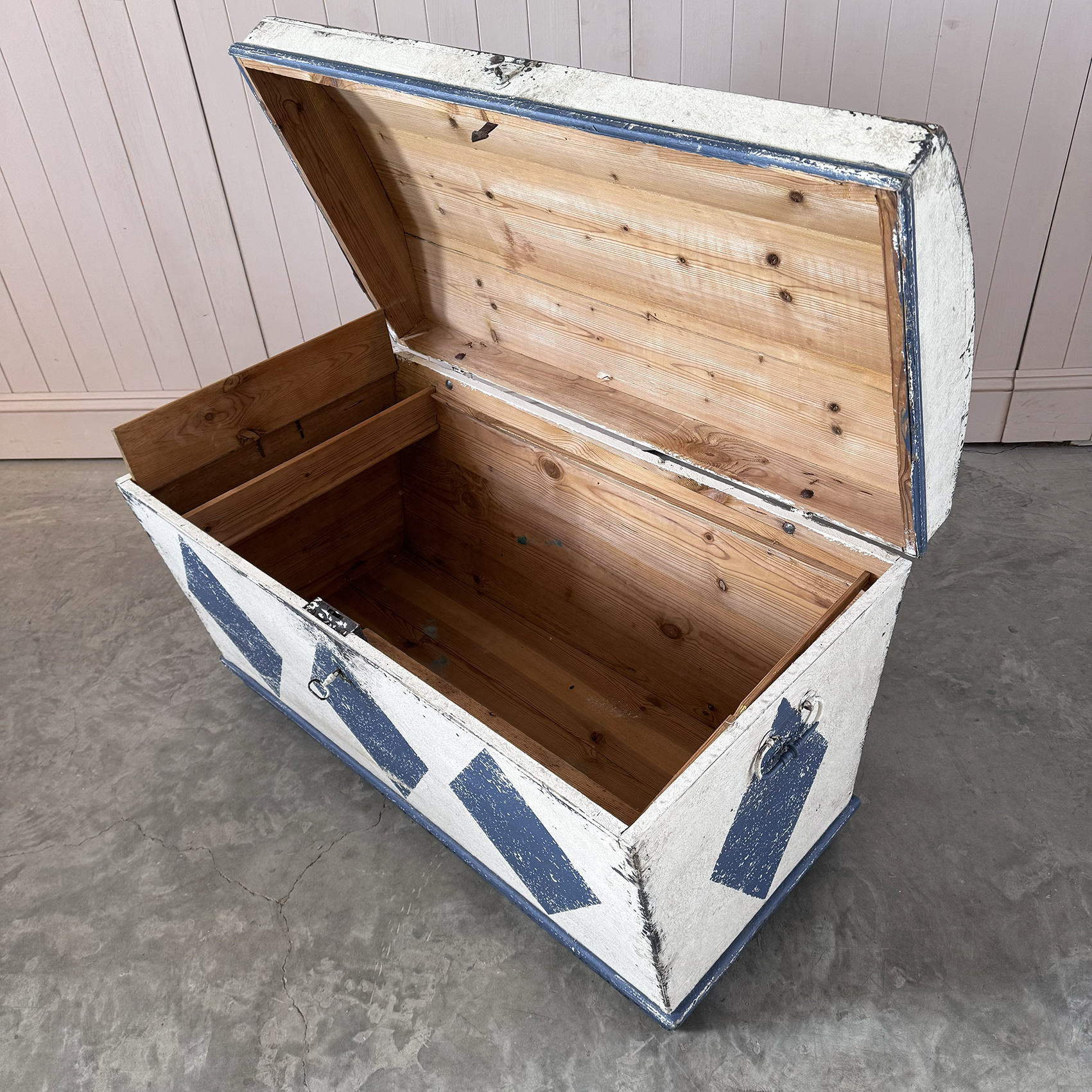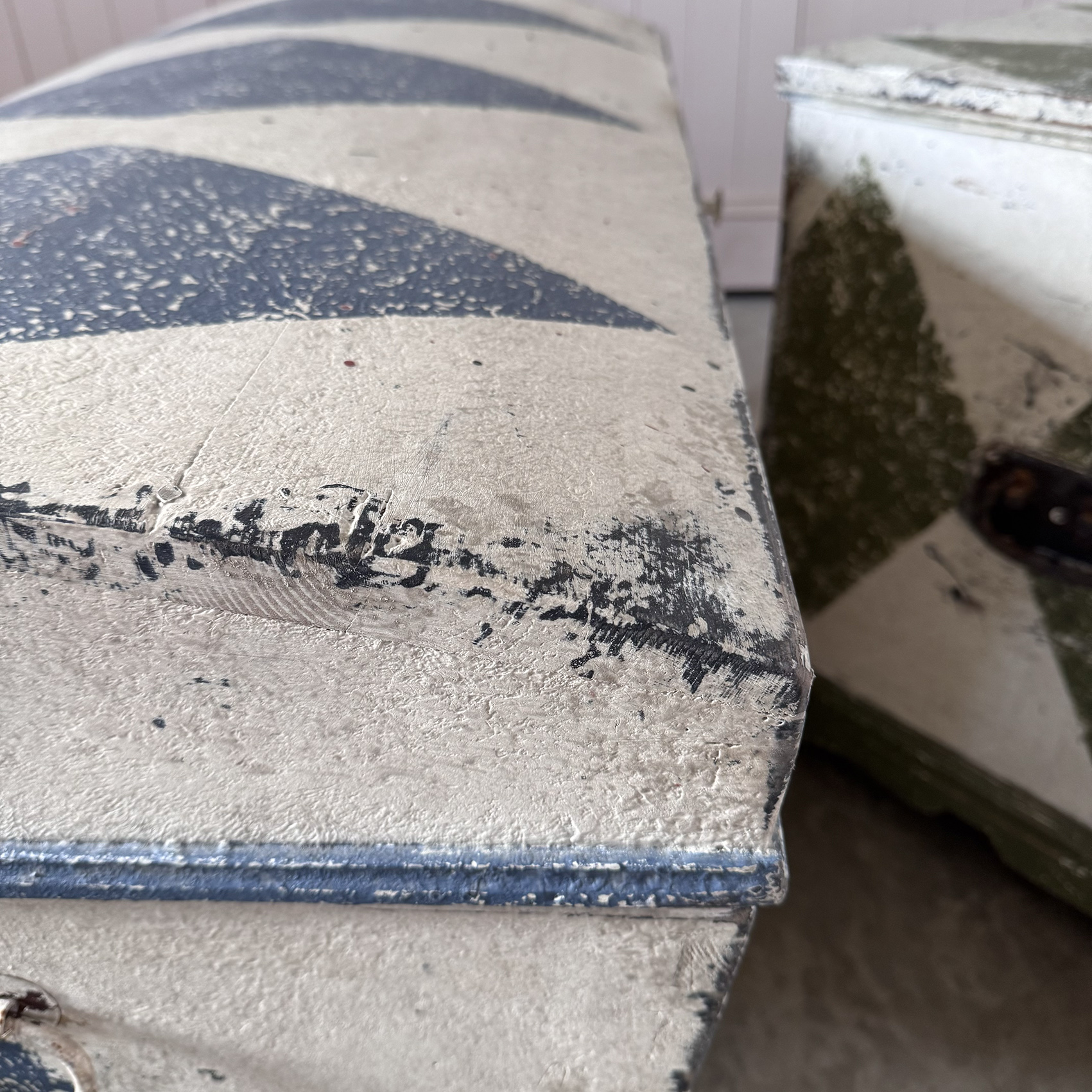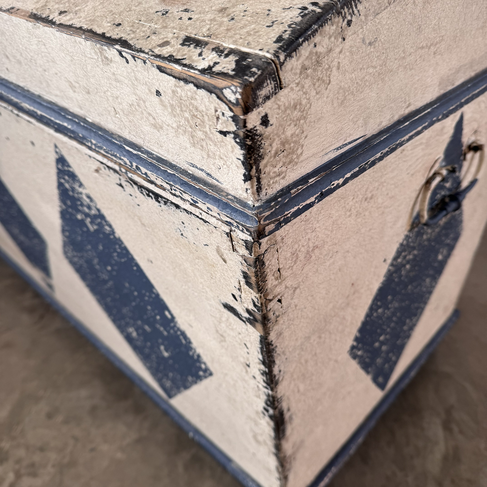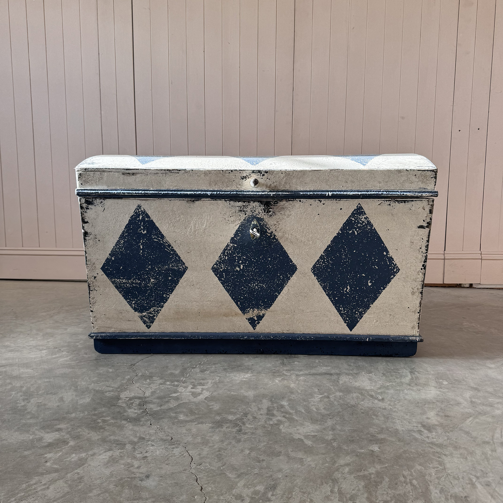 This storage chest is late 19th Century having been recently painted, by us, with this giant blue harlequin design.