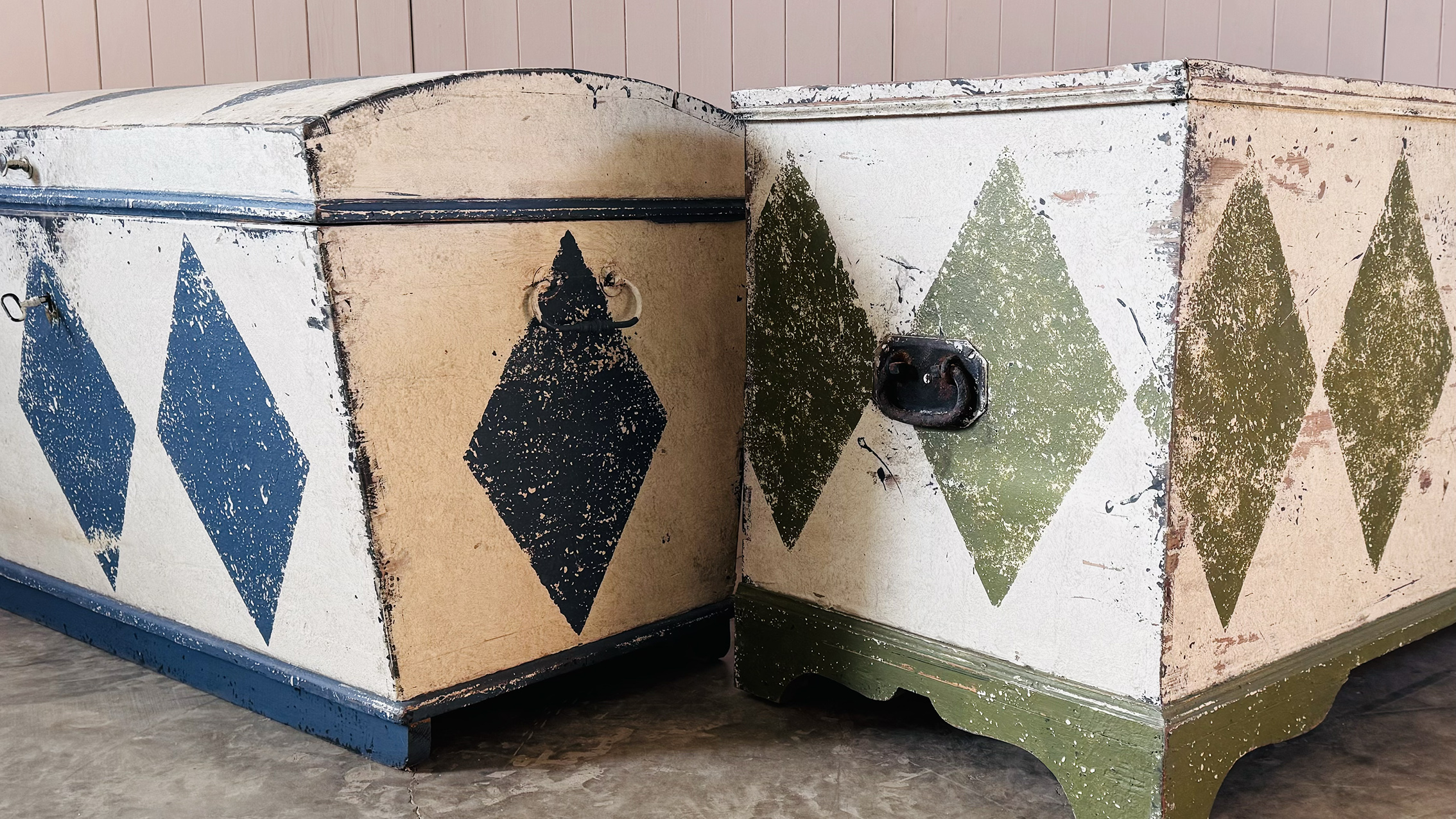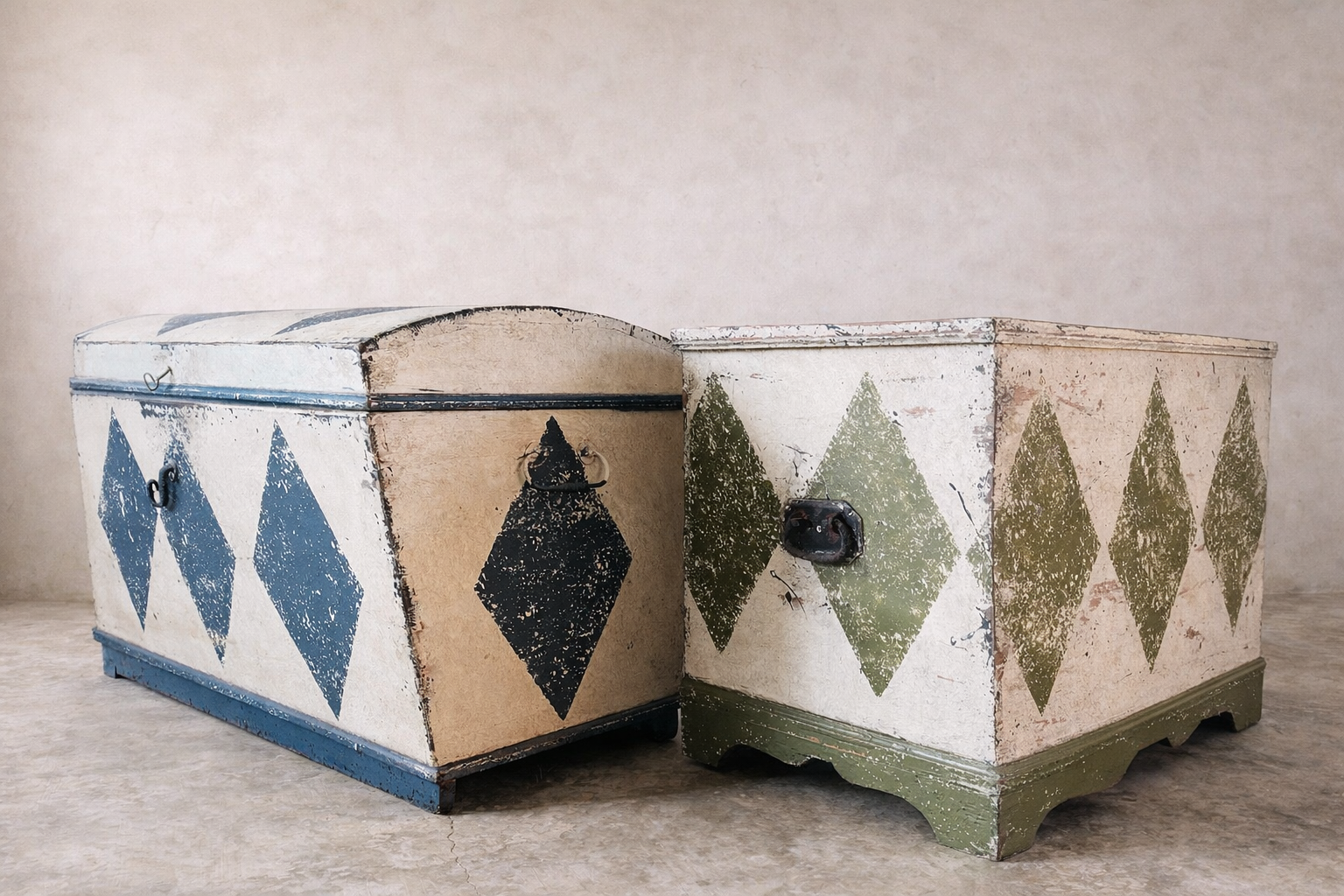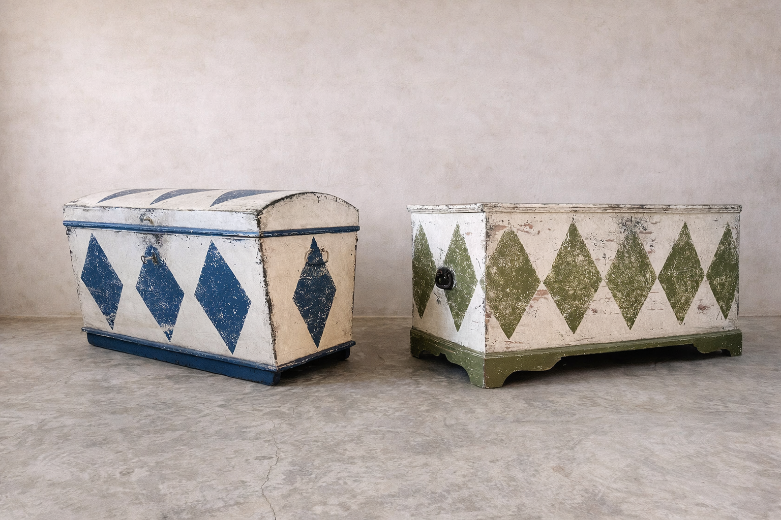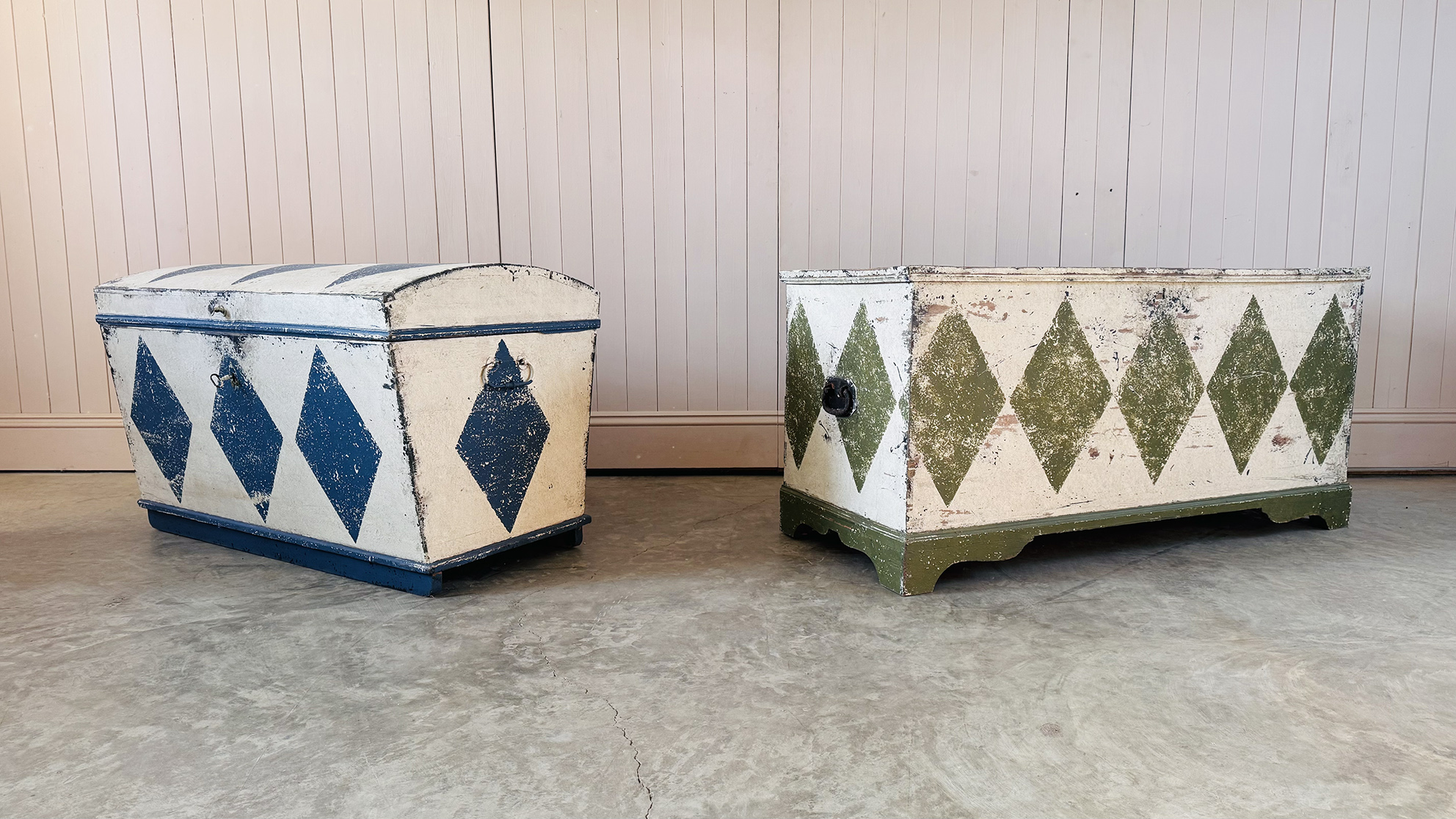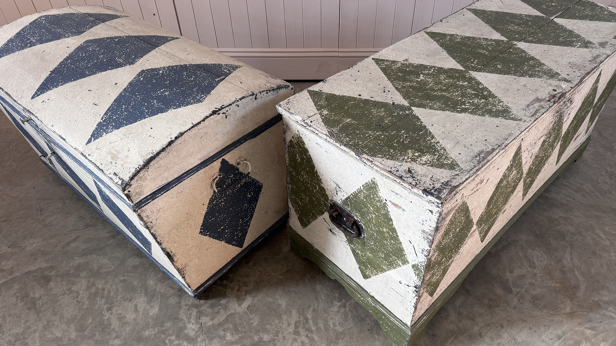 This storage chest is late 19th Century having been recently painted, by us, with this giant blue harlequin design.