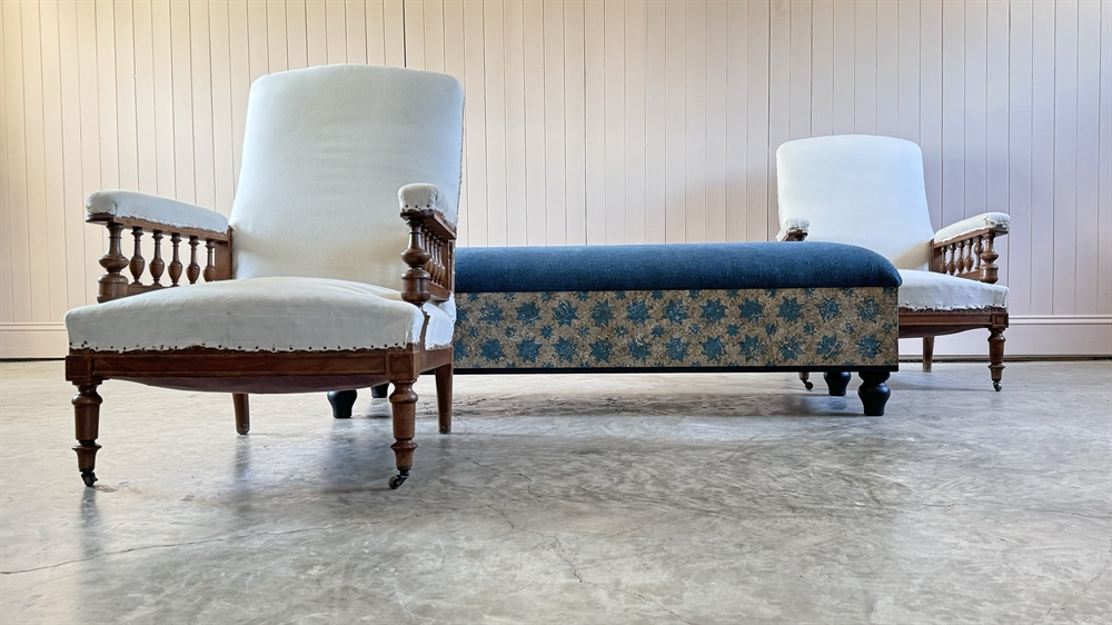 The inspiration for these benches came from an antique Italian Ottoman which we bought and sold with a similar construction.