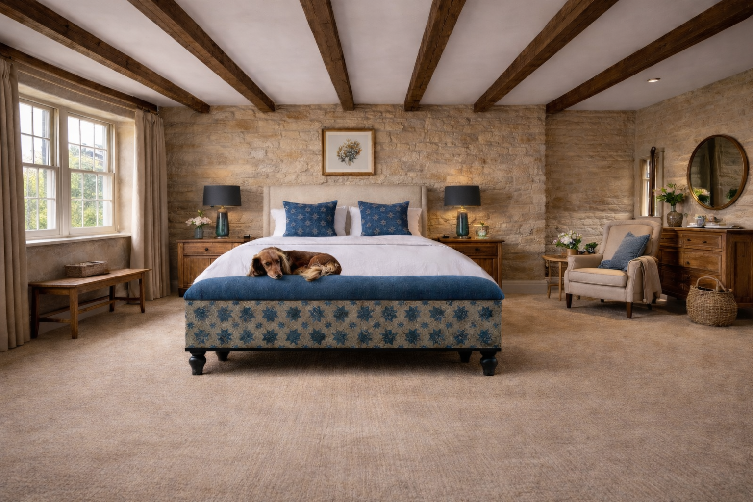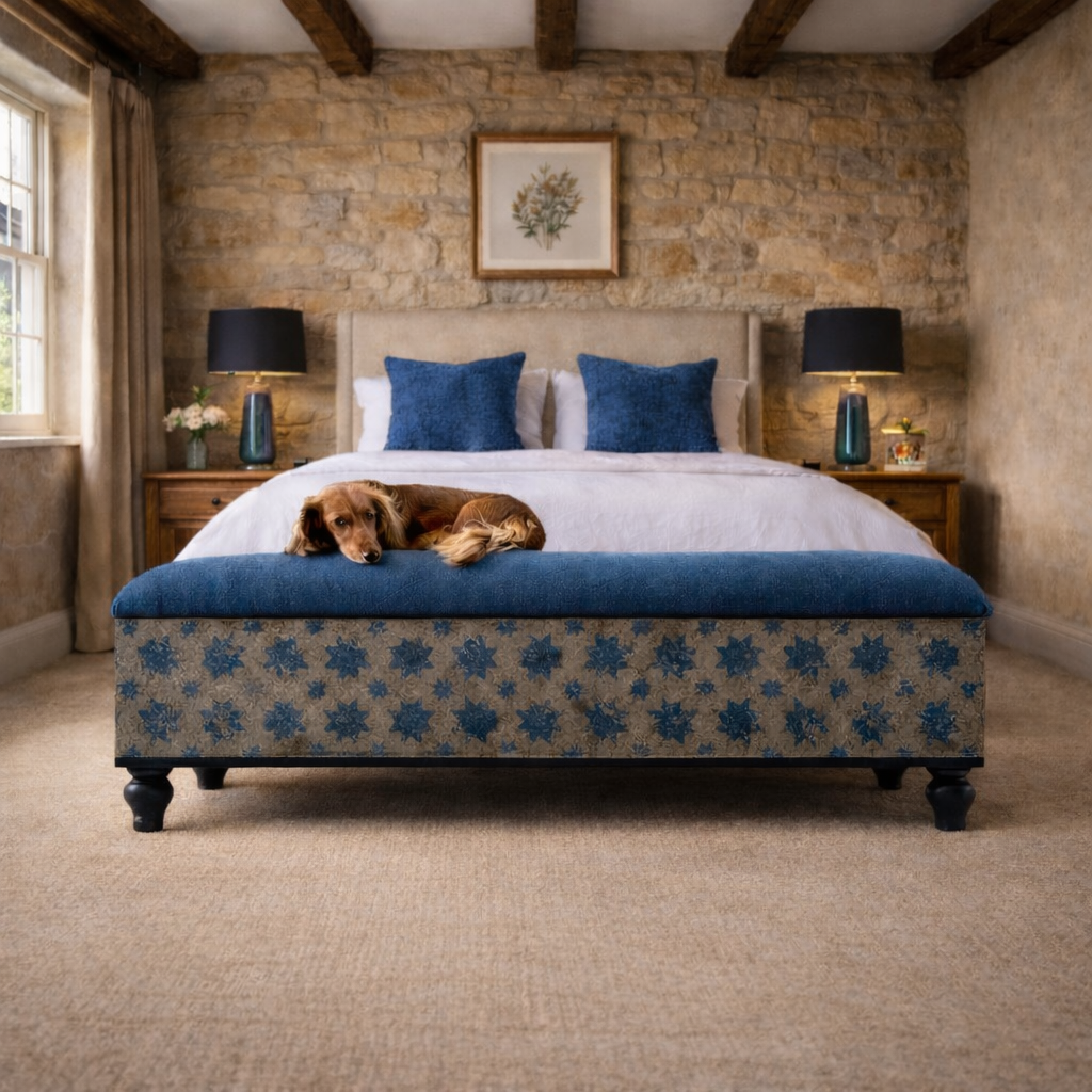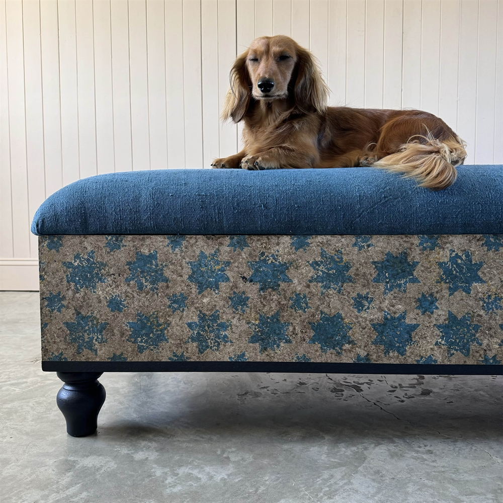 Based on an Antique Italian decorative painted ottoman, the Blue Stars footstool / bench  is handmade  and painted in-house in the Cotswolds.
