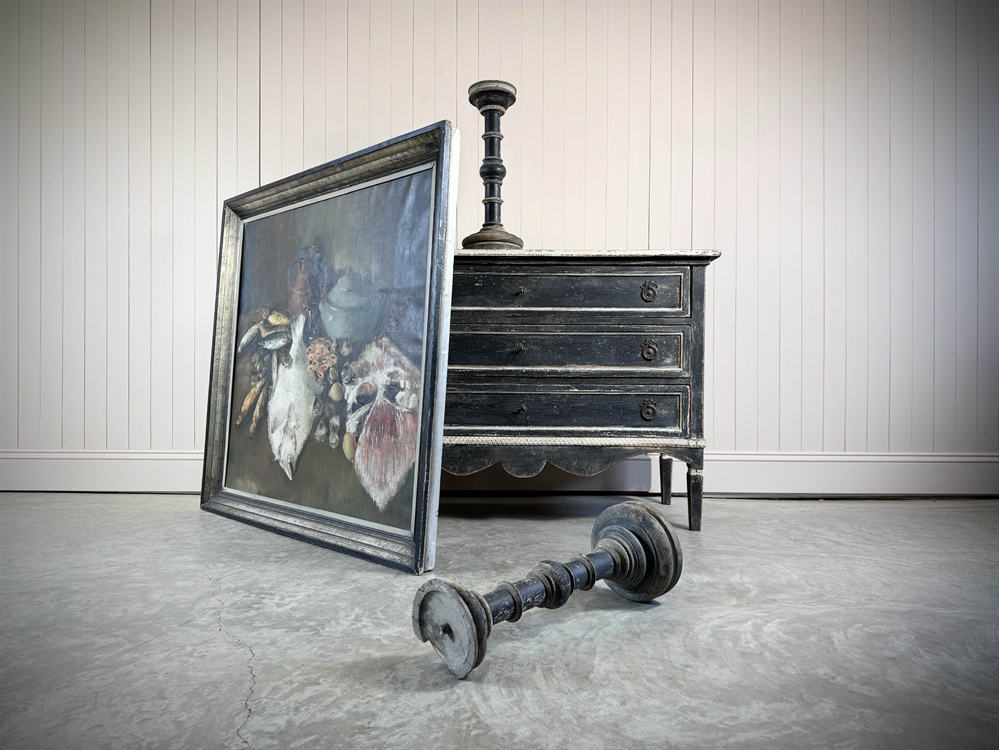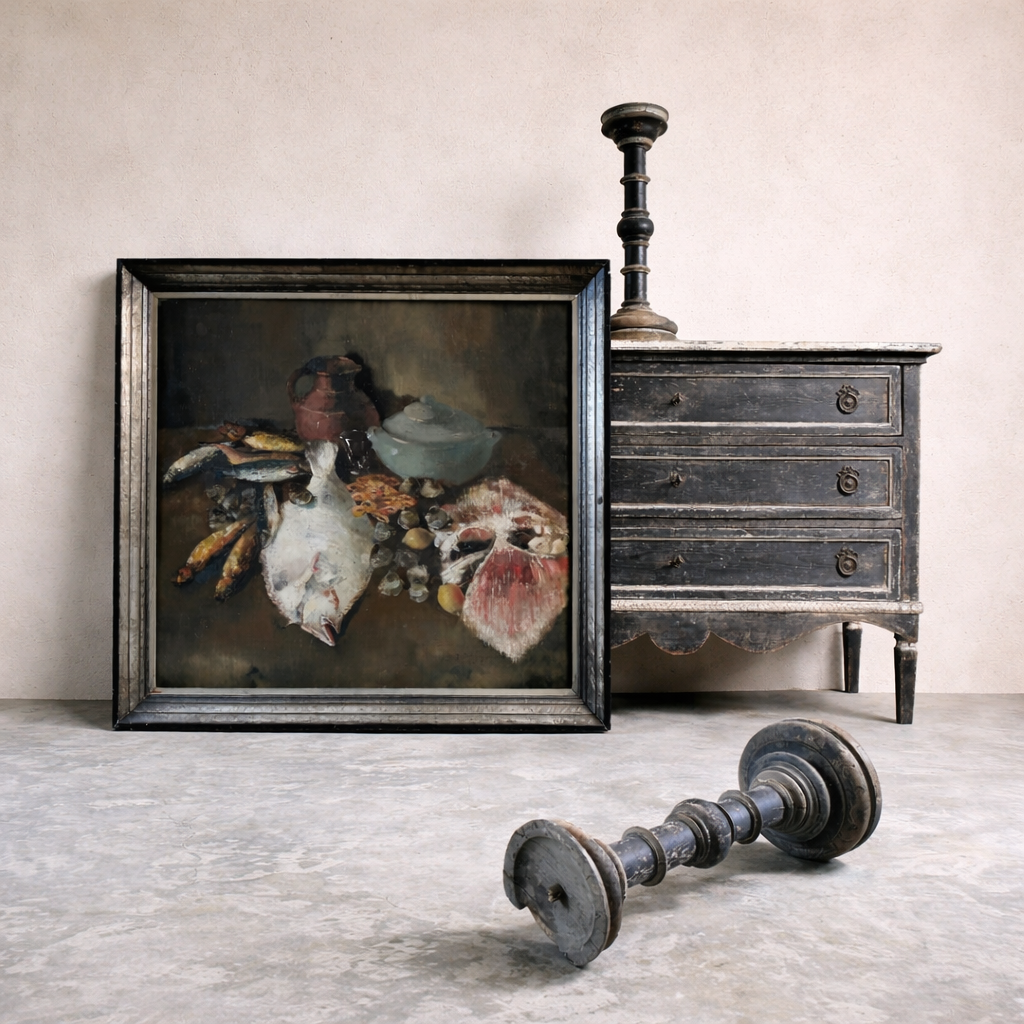 Signed J. De Bruyne and dated 1933. This is a wonderful still life of various fish and sea food, water jug, wine glass and clay cooking pot – everything needed for a delicious fish stew.