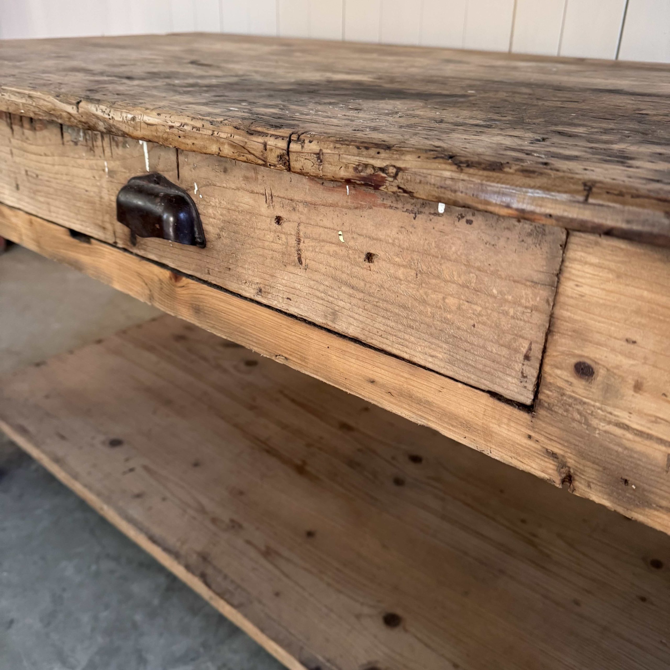 Circa 1930’s made predominately from pine with pegged oak legs. Structurally in good condition but note that is is sourced directly from a factory and it has masses of marks, drill marks, bumps and scrapes as per its age and use – but ( thankfully ) no nasty oil spills.