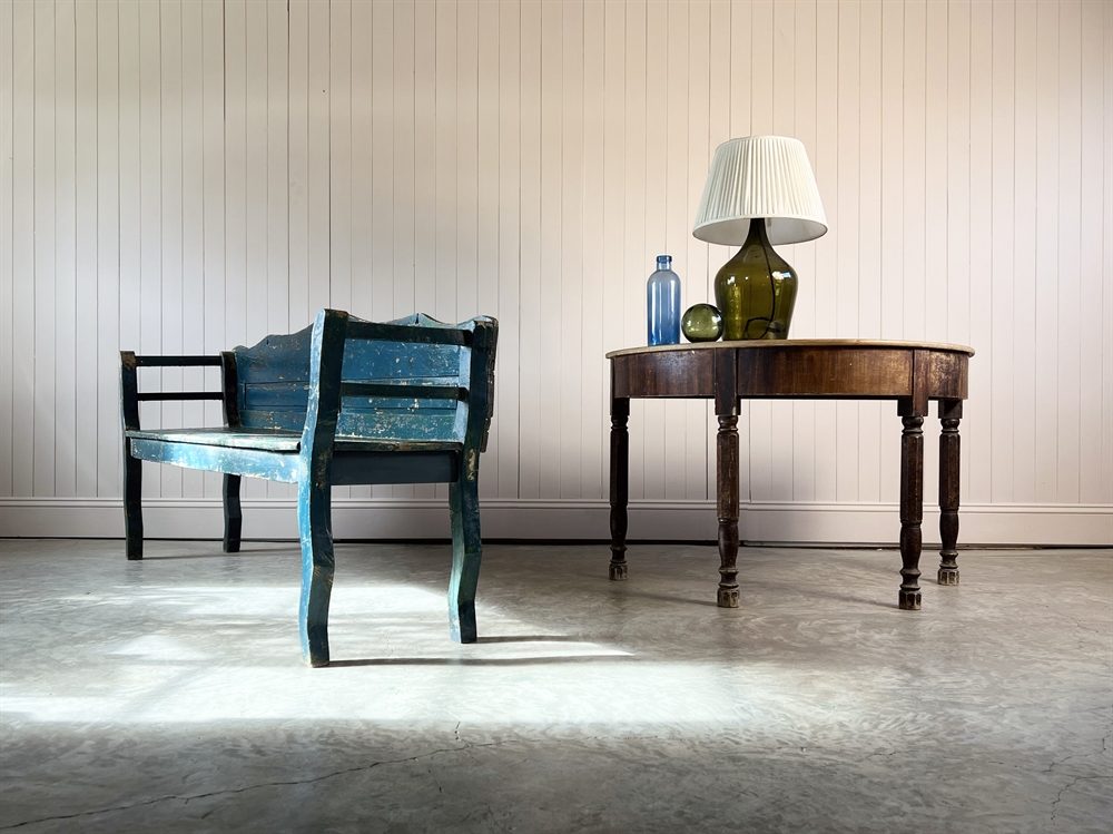 We were very drawn to the shape of the legs and the overall natural patina of these painted side tables. Other than waxing the pine tops we have not touched these, hardly even brushed the cobwebs off the feet. It is such a cool look clearly showing their age. It would be very easy if you want me to tidy these up a little more.