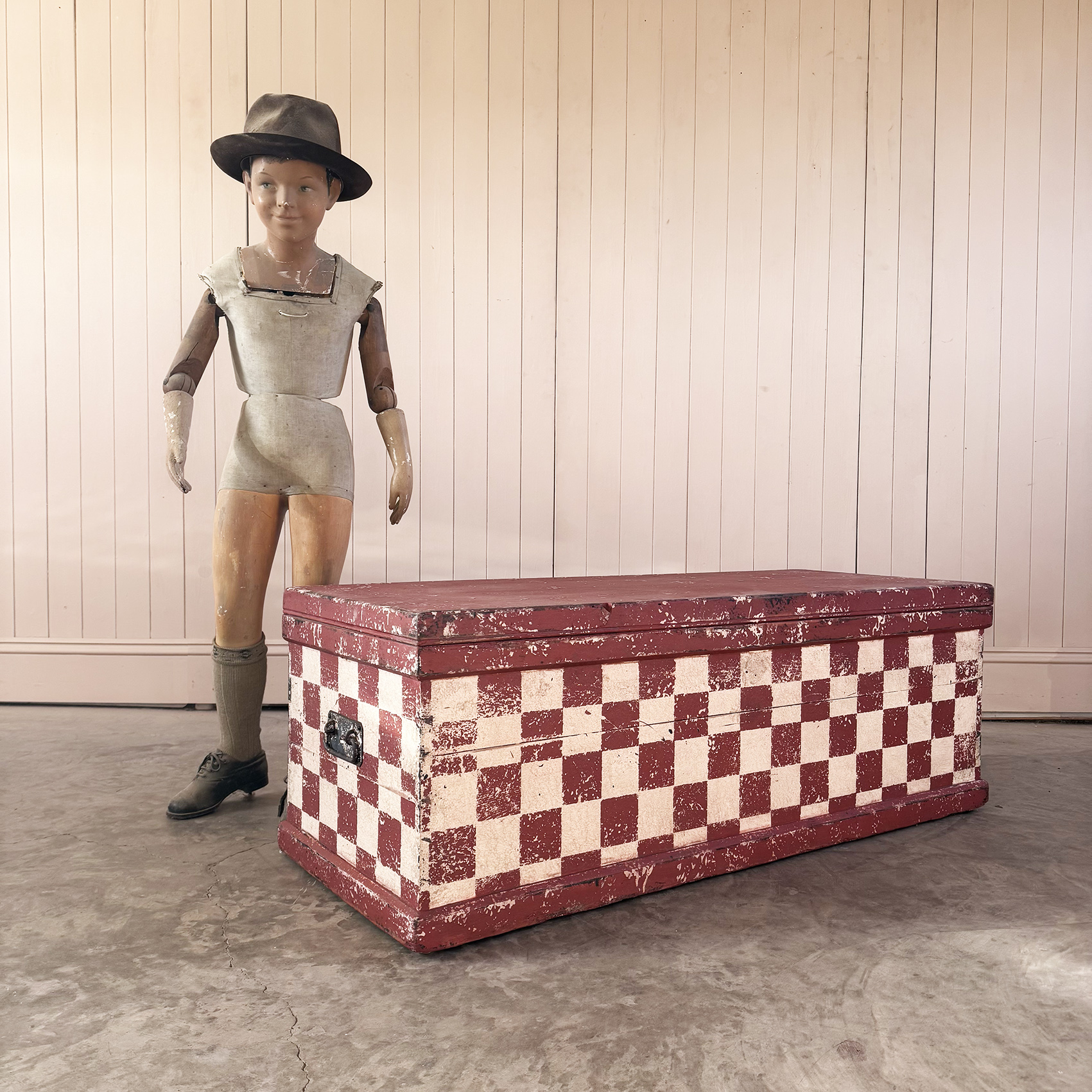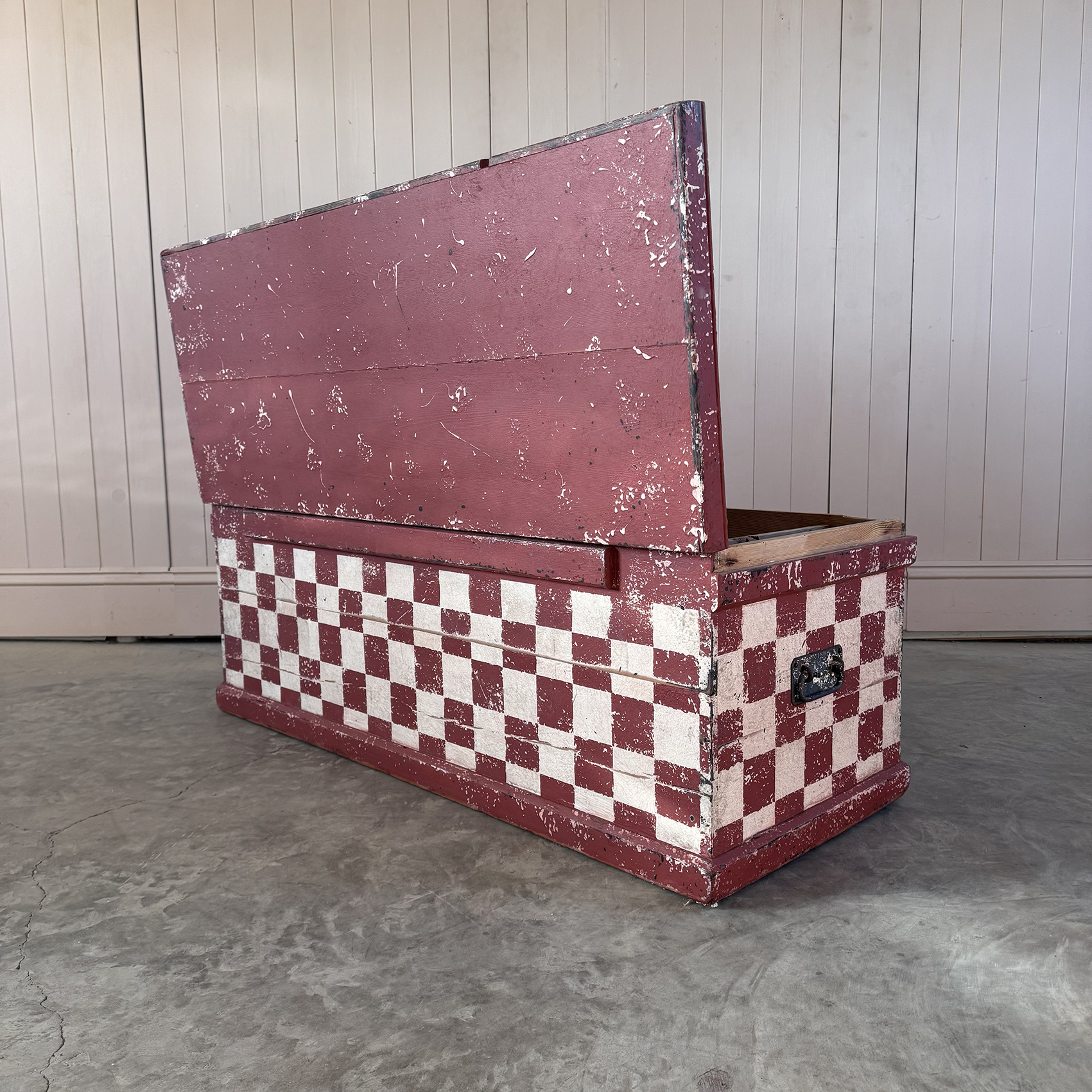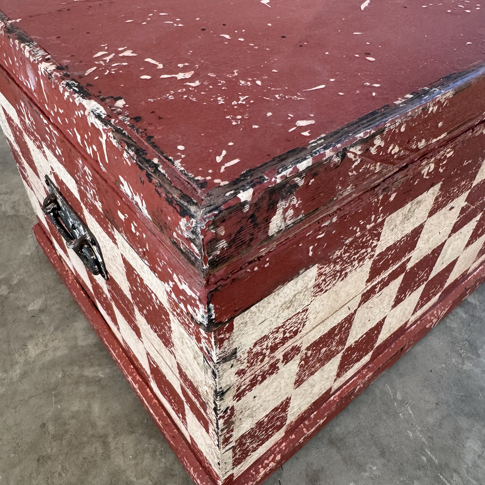 This storage chest is early 20 Century having been recently decoratively painted, by us, with this red checkered harlequin design.