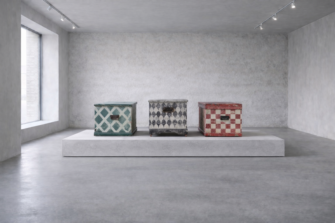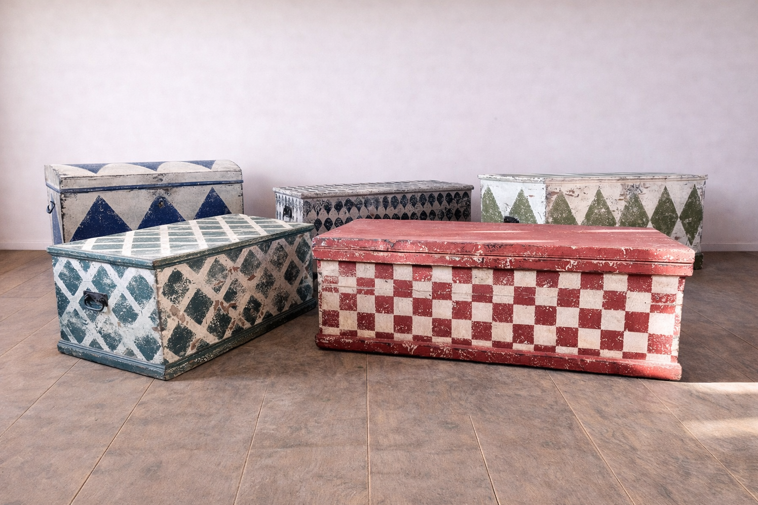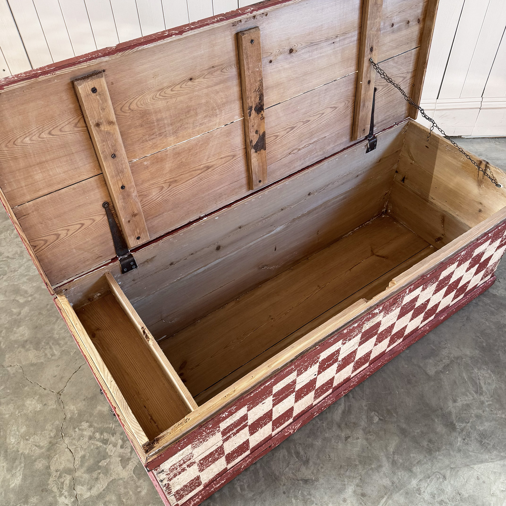 This storage chest is early 20 Century having been recently decoratively painted, by us, with this red checkered harlequin design.