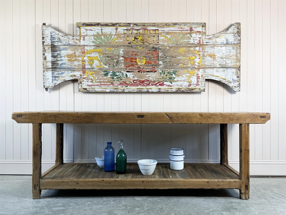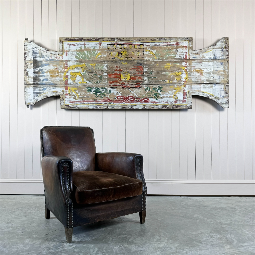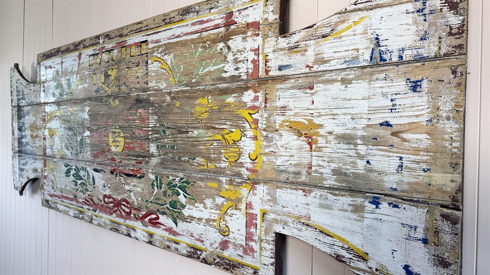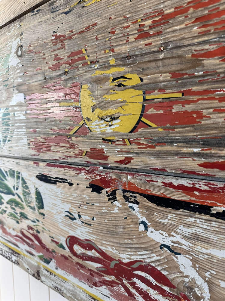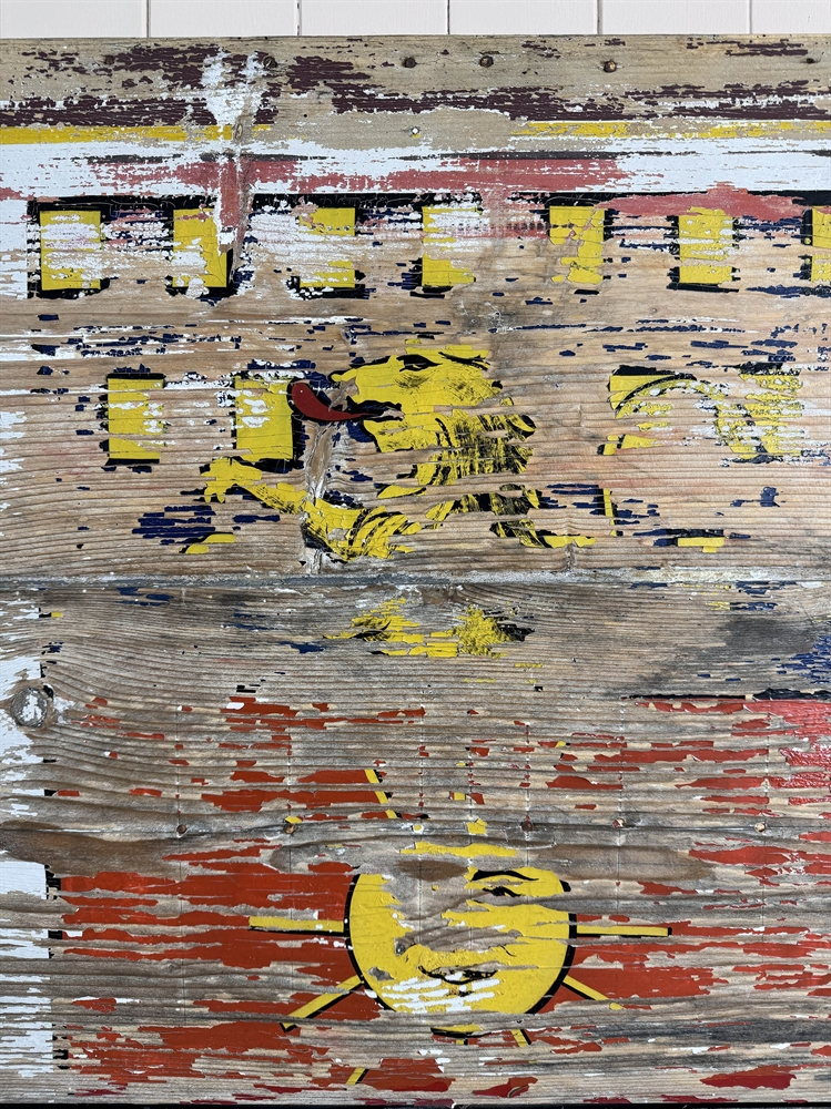 The sign is made from painted pine and would have held a series of flags positioned in a fan through the top of the sign.