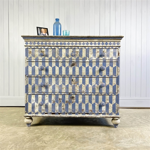 A beautifully made and detailed antique English chest of drawers which has been newly painted, brilliantly knocked back and aged producing this lovely geometrically patterned piece.